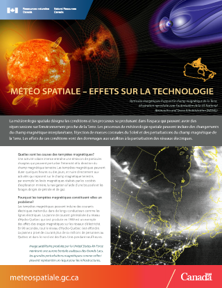 Les tempêtes géomagnétiques peuvent induire des courants électriques inattendus dans de longs conducteurs comme les lignes électriques. Ressources naturelles Canada mène des projets de recherche ciblant particulièrement les réseaux d'électricité. Les entreprises de services d'électricité utilisent les résultats de ces travaux pour sans cesse améliorer leurs méthodes d'exploitation de manière à ce que l'impact des perturbations magnétiques sur les réseaux électriques soit réduit au minimum. Les compagnies d'électricité peuvent également se servir des prévisions météorologiques spatiales de Ressources naturelles Canada pour surveiller étroitement les tempêtes géomagnétiques.