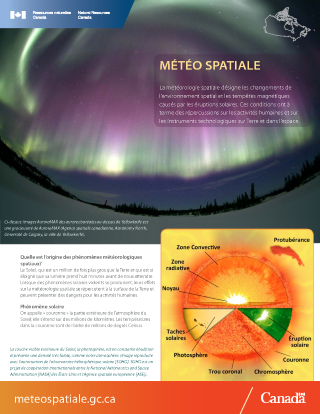 La météo spatiale est un terme qui a été créé au cours des dernières années pour désigner une série de processus physiques émanant du Soleil et qui peuvent affecter les activités humaines sur Terre et dans l'espace. Le Soleil émet de l'énergie, sous forme d'éruptions de radiations électromagnétiques (ondes radio, infrarouges, lumière, ultraviolets, rayons X), de particules électrisées, d'éjection de matière coronale (EMC) et de courants de plasma. En s'éloignant du Soleil, ces particules créent le vent solaire et entraînent avec elles une partie du champ magnétique du Soleil. Les radiations électromagnétiques voyagent à la vitesse de la lumière et prennent environ 8 minutes pour franchir la distance entre le Soleil et la Terre, tandis que les particules électrisées voyagent plus lentement et peuvent prendre de quelques heures à plusieurs jours pour franchir la même distance. Les radiations et les particules interagissent avec le champ géomagnétique de la Terre et l'exosphère de façon complexe, provoquant l'accumulation de particules énergétiques et la circulation de courants électriques dans différentes régions de l'exosphère (magnétosphère et ionosphère). Cela peut causer des variations géomagnétiques, des aurores, et peut affecter différents outils technologiques. Pour plus d'informations, voir ci-dessous.
